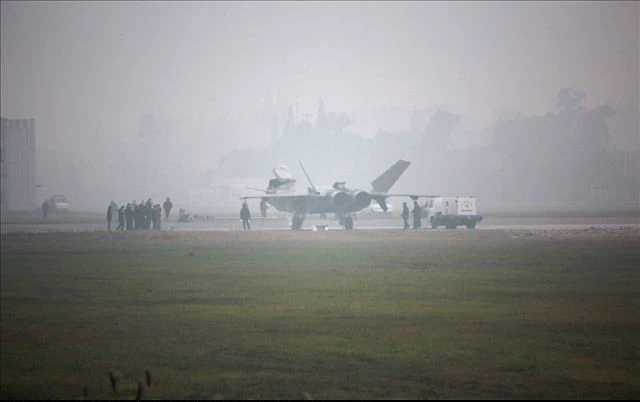 | Nhiều người tập trung tại đường băng khi J-20 hạ cánh. Ảnh: Xinhua. |