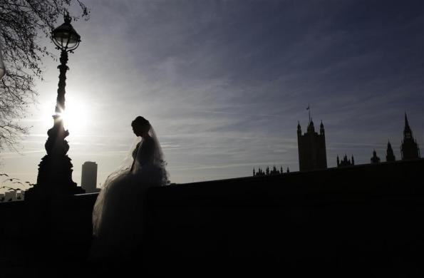 Một cô dâu đang ngồi trên bức tường đối diện tòa nhà Quốc hội, trung tâm thủ đô London chụp ảnh cưới vào ngày 6-1. Ảnh: Reuters.