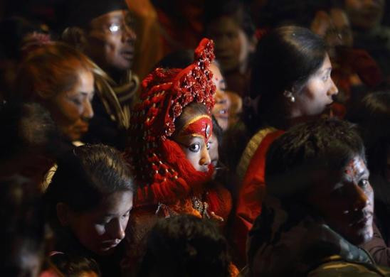 Các tín đồ theo đạo Hindu và đạo Phật tại Nepal đang tập trung quanh Nữ thần sống Kumari (ở giữa) trong một nghi lễ ngày đầu năm. Theo các tin đồ nơi đây, Kumari là cô gái đang bước sang tuổi dậy thì. Cô được chọn là nữ thần được tôn dân tôn thờ trong các dịp lễ, ít nhất là 12 lần/ năm. Ảnh: Reuters.