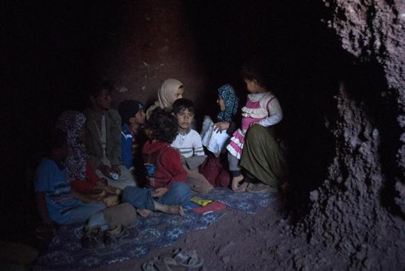 Những đứa trẻ thủ đô Sanaa, Yemen đang trú ẩn tại các hang động ở miền núi Arhab vào ngày 6-1. Các cuộc đụng độ giữa các bộ lạc và lực lượng vũ trang Yemen chống lại chế độ tổng thống Ali Abdullah Saleh vẫn đang diễn ra. Người dân buộc phải sơ tán khỏi ngôi làng của mình. Ảnh: Reuters.