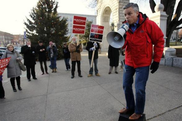 Cựu thống đốc Utah – ông Jon Huntsman tay cầm loa và kêu gọi người dân ủng hộ ông trong chiến dịch bầu cử tổng thống Đảng Cộng hòa. Ảnh: Reuters.