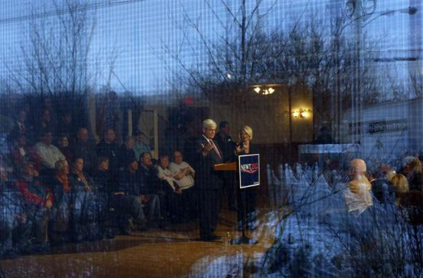 Ứng cử viên của Đảng Cộng hòa cùng Phát ngôn viên của Hạ viện Newt Gingrich (ở giữa) đang phát biểu ở bên ngoài Nhà hát lớn trong một chiến dịch tranh cử vào ngày 5-1. Cuộc bầu cử sơ bộ của Đảng Cộng hòa sẽ tổ chức vào ngày 10-1 trên phạm vi cả nước. Ảnh: Reuters.