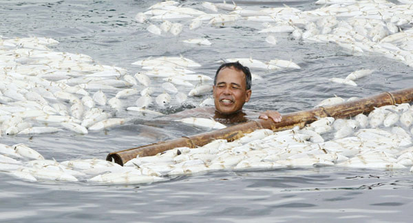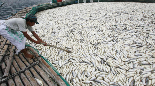 Cá chết nổi trắng xóa trên mặt hồ, chủ yếu là cá măng, một loại thực phẩm phổ biến trong bữa ăn hàng ngày của người Philippine.