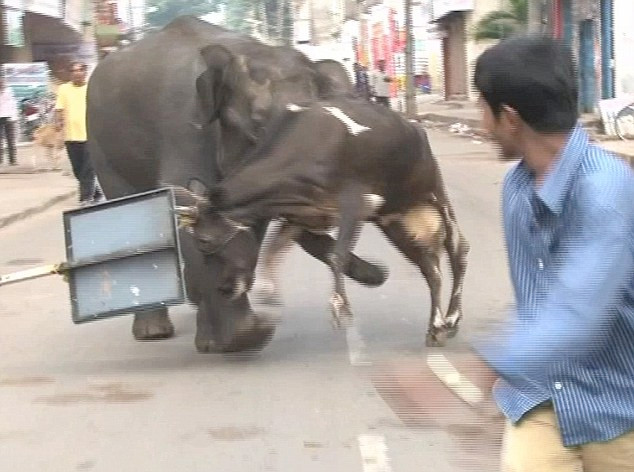 Một con bò bị cột bên đường cũng trở thành nạn nhân của voi điên.