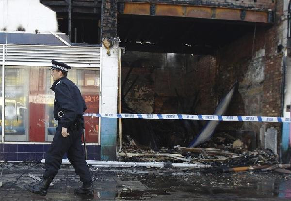 Nhiều kẻ lợi dụng sự hỗn loạn, tấn công các cửa hiệu trong khu vực để hôi của. Trong ảnh là một cửa hiệu nhỏ bị đốt cháy trong đêm. Ảnh: THX.
