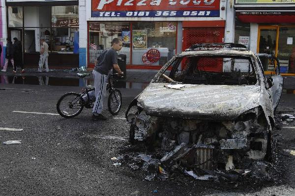 Một cậu bé ngó vào chiếc xe cảnh sát đã cháy rụi. Đây là hành động bạo loạn tồi tệ nhất xảy ra tại thủ đô nước Anh trong nhiều năm qua.