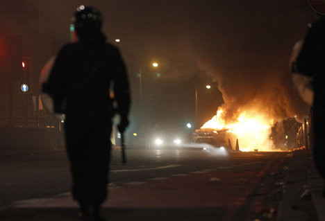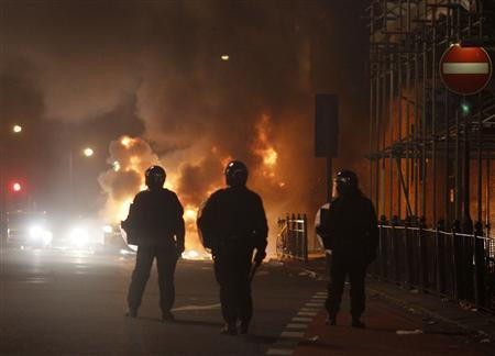 Những kẻ quá khích ném bom xăng đốt cháy hai chiếc xe của cảnh sát và một chiếc xe bus hai tầng. Ảnh: Reuters.