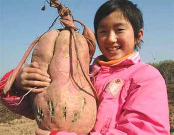 | Một em bé đang chiêm ngưỡng củ khoai khổng lồ |