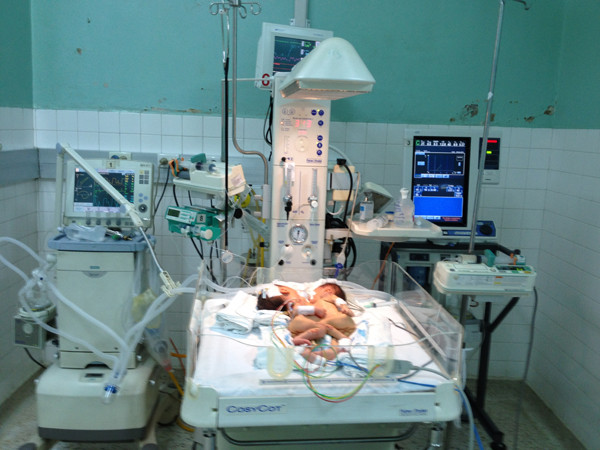 Theo bác sĩ Định hai bé dính nhau phần ngực và bụng, chỗ dính vùng ngực cao cách đầu trên xương ức 2cm, phía dưới cách cuống rốn khoảng 3cm, 2 bé có chung một rốn. Trong khi siêu âm bụng, phát hiện hai bé dính nhau phức tạp ở phần gan và đường mật; hai tim dính nhau, có chung màng ngoài tim. “Hiện tại cả hai bé đang suy hô hấp do viêm phổi nên được đặt nội khí quản và cho thở máy”- bác sĩ Định cho biết.