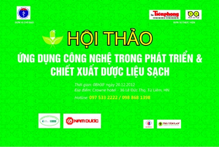 Hội Thảo “ Ứng dụng công nghệ trong phát triển và chiết xuất dược liệu sạch tại Việt Nam “ do Báo Tiền Phong kết hợp công ty cổ phần truyền thông Bách An tổ chức tới đây vào ngày 20/12/2012 có sự tham gia của các lãnh đạo cơ quan chuyên nghành: Bộ y tế, cục quản lý dược, các chuyên gia, giáo sư, bác sĩ đầu nghành trong công tác giảng dạy và nghiên cứu dược phẩm. Các doanh nghiệp kinh doanh sản xuất dược phẩm uy tín hàng đầu tại Việt Nam như Traphaco, Nam Dược, Eco,… là cơ hôi giao lưu để doanh nghiệp và ban nghành cùng nhìn lại chặng đường thực hiện đề án “Phát triển công nghiệp dược và xây dựng mô hình hệ thống cung ứng thuốc của Việt Nam giai đoạn 2007 - 2015 và tầm nhìn đến năm 2020” của Chính phủ, khi đã xác định: xây dựng cơ sở chiết xuất hoạt chất tinh khiết từ dược liệu để đảm bảo 20% nhu cầu hoạt chất cho sản xuất thuốc vào năm 2015 và 30% vào năm 2020.