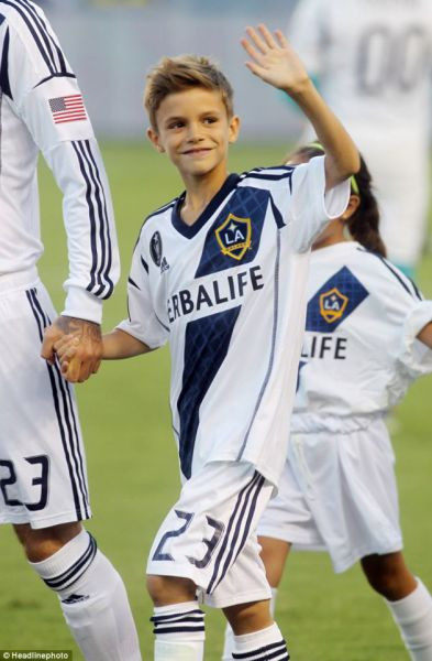 Sự có mặt của hai bố David Beckham trên sân cỏ trước giờ thi với Vancouver Whitecap trong ngày 1-9 khiến cả khán đài ngạc nhiên. Trong trang phục giống bố, Romeo James tươi cười vẫy tay chào khán giả.