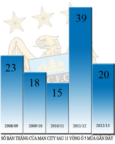 Man City gây thất vọng ở Champions League và tụt lại sau kình địch Man United tại Premier League không hẳn do hàng công. Ngoại trừ Balotelli, các chân sút Man xanh đều đang thi đấu đạt yêu cầu. Aguero và Tevez vẫn sắc sảo khi có cơ hội, còn Dzeko liên tục tỏa sáng mỗi lần vào sân từ ghế dự bị. Thành tích ghi 20 bàn thắng sau 11 vòng đấu đầu tiên tại Premier League mùa này cho thấy tuyến trên của Man City không kém cỏi chút nào.