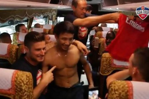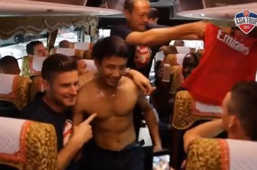 | Xuân Tiến được các cầu thủ Arsenal chào đón nhiệt tình trên xe. |