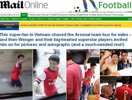 | Hình ảnh về "Running Man" Xuân Tiến xuất hiện trên trang chủ của Arsenal, nhiều tờ báo ở Việt Nam cũng như ở Anh. |