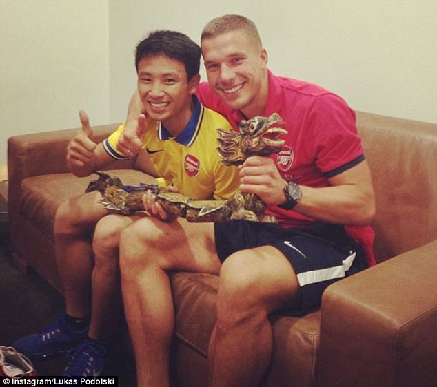 Trước đó, tiền đạo Lukas Podolski đã đăng tải hình cá nhân với Running Man lên tài khoản Instagram của mình. Anh tỏ ra phấn khởi khi nhận được món quà tượng khắc hình con rồng.
