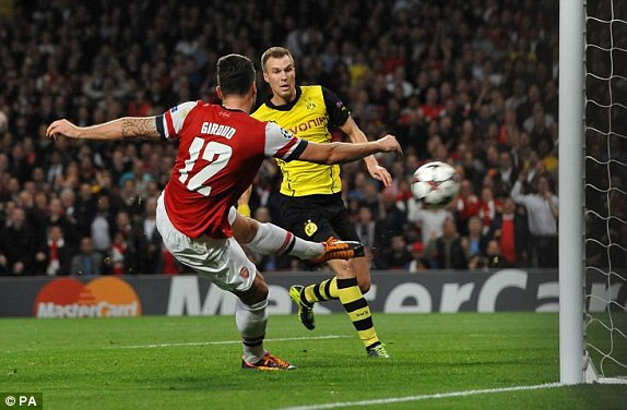 Bên kia chiến tuyến, pha lao ra đón ói bóng của thủ môn Roman Weidenfeller tạo điều kiện để Olivier Giroud gỡ hòa cho Arsenal trước khi hiệp một kết thúc.