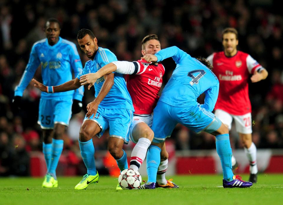 Phút 55, Giroud (12-Arsenal) dứt điểm bằng chân trái. Bóng đi nhẹ nhưng đập chân một hậu vệ đội khách đổi hướng lăn từ từ ra mép ngoài cột dọc khi thủ thành của Marseille đã đứng nhìn.