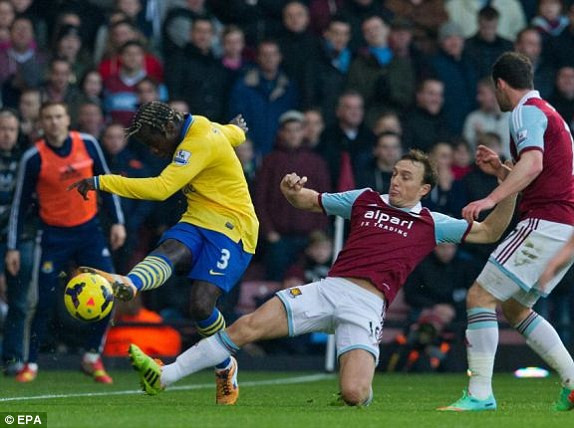 Phút 16, Cazorla (19-Arsenal) có pha bay người đánh đầu sát vạch vôi đưa bóng cắm thẳng vào góc cao bên trái, nhưng thủ thành Adrian (13-West Ham) bay người cứu nguy cho chủ nhà.