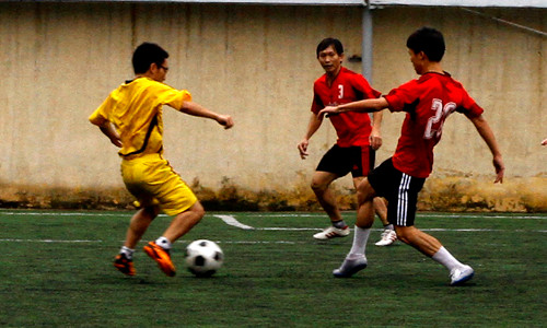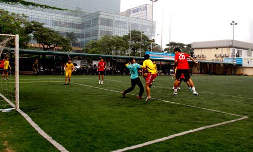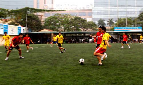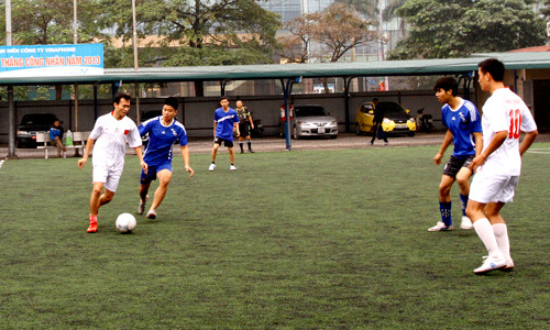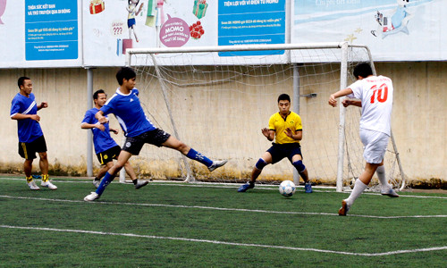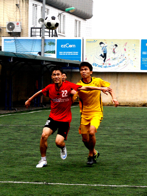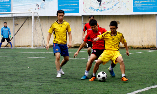 | Mở màn là cuộc đối đầu giữa đội Vinaphone (áo vàng) - Mobifone (áo đỏ). |