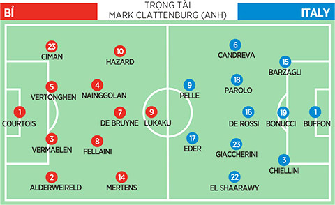 Kinh nghiệm của De Rossi và màn trình diễn trong trận gặp Phần Lan, bài test cuối cùng trước EURO, sẽ là cơ hội để anh đá chính ở hàng tiền vệ, thế chỗ Thiago Motta. Parolo và Giaccherini, những tiền vệ con thoi, sẽ chơi bên anh, trong khi hy vọng của các tifosi cũng đặt cả ở Candreva, người có phong độ tốt nhất thời điểm hiện tại. Đặt trên cái trụ là hàng thủ Juventus, Italy cần sự mạnh mẽ, tính chiến đấu, sự thực dụng, và đặc biệt là biết chế ngự sức mạnh Bỉ.