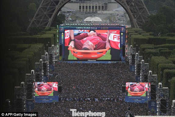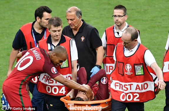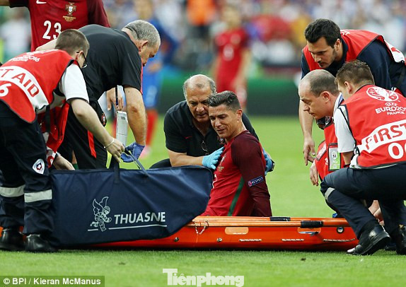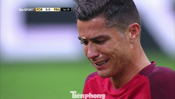 Phút thứ 8 của trận chung kết giữa Bồ Đào Nha và Pháp sáng nay, Ronaldo đã phải nằm sâu sau pha va chạm với Payet của Pháp.