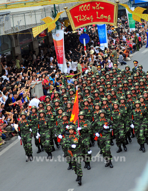 Phần diễu binh với 1,2 vạn người tham gia gồm 15 khối bộ đội, công an, dân quân tự vệ; 10 máy bay mang cờ Tổ quốc và dòng chữ kỷ niệm 1000 năm Thăng Long - Hà Nội.