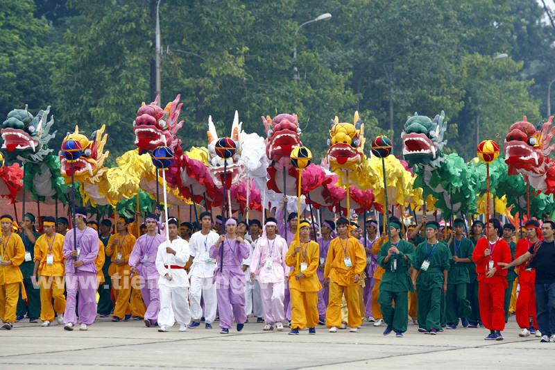 8h30, phần diễu hành của Thủ đô Hà Nội. Dẫn đầu khối diễu hành là xe mang hình ảnh rồng thời Lý.