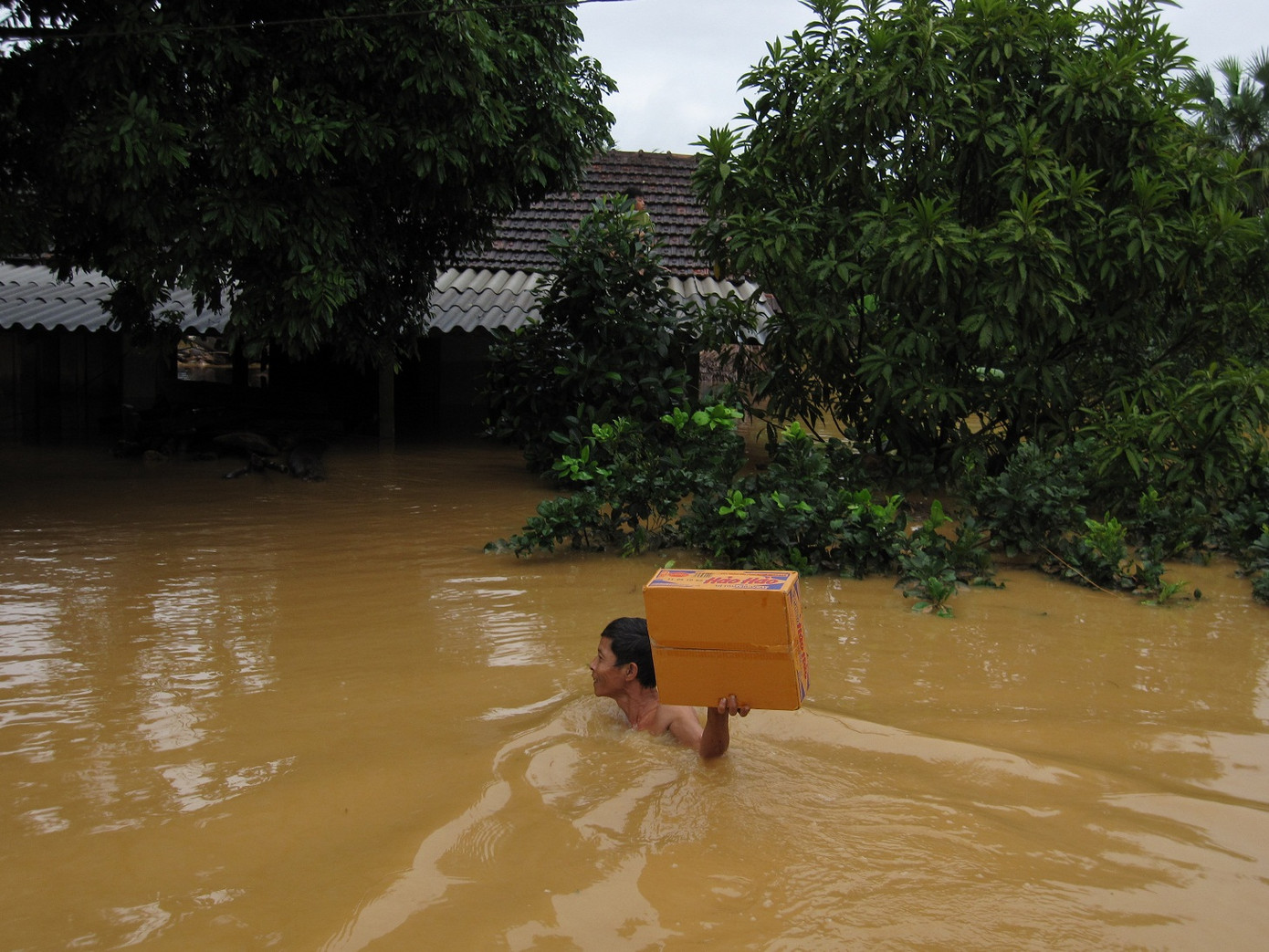 | Người dân bơi giữa dòng nước lũ nhận cứu trợ mỳ tôm. Ảnh: Minh Thùy.. |