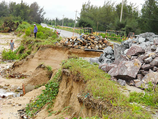 Trong khi đó, sáng ngày 2-11, mưa lớn, kết hợp với nước từ thượng nguồn về nên triều cường đã làm sạt lở 50m đường giao thông nông thôn tại xóm An Vũ, xã An Ninh Đông, huyện Tuy An.