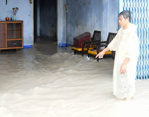 Nước lũ phá vỡ tường nhà bà Dương Thu Cúc ở thôn Tân Thành, chảy ra QL1A. Ảnh: Đình Quân