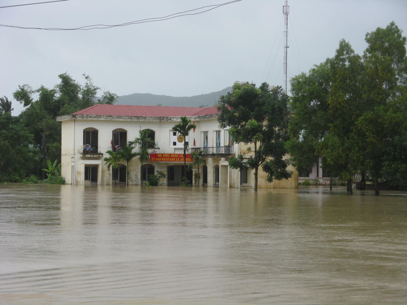 Nước thượng nguồn đổ về đã gây ngập trụ sở xã An Định, huyện Tuy An, Phú Yên. Ảnh: Văn Tài