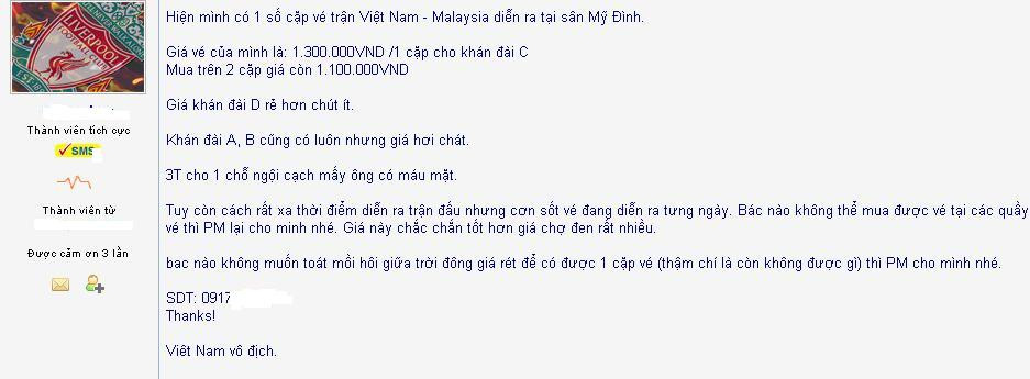 Hôm nay, dù vé chưa về Việt Nam, anh Trần Văn Hiển, một người hâm mộ, không ngần ngại bỏ ra 200.000 đồng đặt cọc "mua vé ngoài". Theo người bán ở Mỹ Đình, ngày mai, 16 - 12, có vé, sẽ trả tận tay người mua.