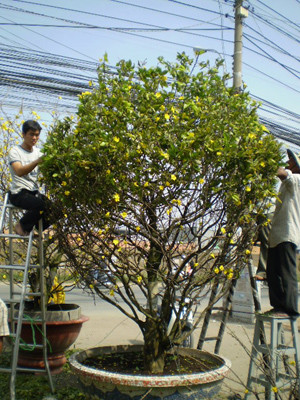 Theo nhiều chủ vườn mai, dù còn mươi ngày nữa mới đến Tết song đến thời điểm này, hàng chục gốc mai thế dành cho thuê đã có chủ. Tại nhiều vườn kiểng, mai cho thuê thường rất đẹp và đắt tiền. Nhiều chậu mai lâu năm, đường kính gốc trên 25cm có giá hơn 10 triệu đồng. |