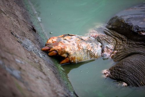 | Cận cảnh vết lở loét, ố vàng ở bàn chân cụ rùa Ảnh: Nguyễn Khánh, Tiến Thành. |