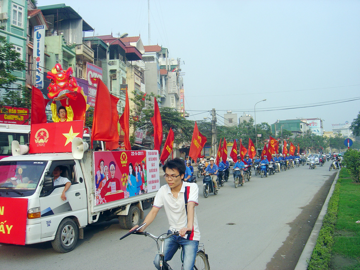 Đoàn diễu hành tuyên truyền bầu cử trên đường Hồ Tùng Mậu (quận Cầu Giấy, Hà Nội). Ảnh: Tiến Dũng