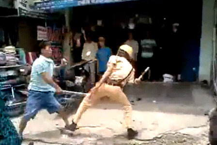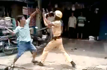 Trong đoạn clip được người đi đường quay lại và đưa lên mạng thể hiện, khi “quyết chiến” với CSGT thanh tuýp sắt trên tay người này bị văng xuống đất nhưng ngay sau đó người vi phạm nhặt lên để tiếp tục tấn công CSGT. Thời điểm hai bên ở thế giằng co thì người thanh niên liên tục dùng chân đá vào người đang thi hành công vụ. Sau đó người này dồn CSGT vào một cửa hàng bán phụ tùng ô tô gần đó. Khoảng 10 phút thì người vi phạm lấy xe máy phóng đi.