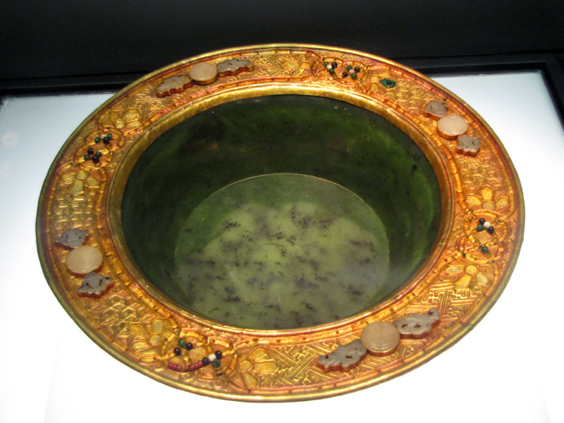 | Chậu Ngọc xanh xám sẫm nhiều màu bịt vàng thời Nguyễn. Đồ Cung đình Huế. |
