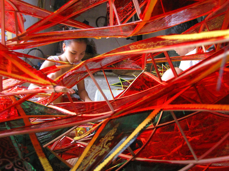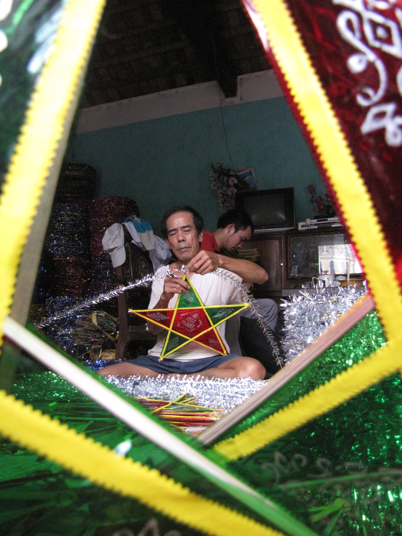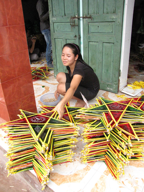 Để làm được một chiếc đèn ông sao, phải qua rất nhiều công đoạn. Từ chẻ tre, vót nứa, in hoa văn, màu sắc trên giấy bóng, đến cắt khung, làm xương đèn, dán giấy bóng, lắp cán…