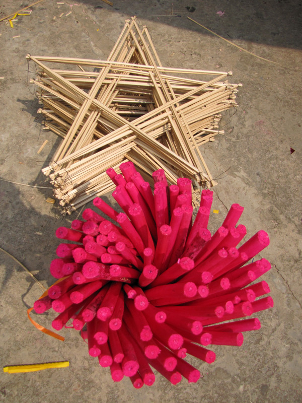 | Những chiếc cán đèn được làm từ cây đay, sau đó cưa khúc, nhuộm màu hồng rực rỡ. |