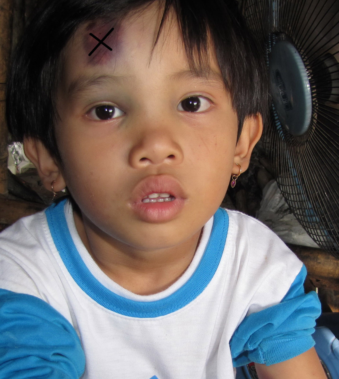 Kiểm tra trên thân thể cháu, người nhà phát hiện hai cánh tay phía trong (đoạn dưới nách) của bé bị thâm tím thành vệt dài, kèm vết cấu nhéo của các đầu ngón tay người lớn. Trước trán cháu bị bầm dập một mảng lớn, lan húp đến hốc mắt bên phải, trên má hằn rõ các vết đỏ dấu ngón tay người lớn.