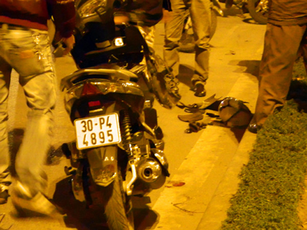 Tại hiện trường, chúng tôi thấy, chiếc xe máy BKS 30P-4895, bị hư hỏng nặng phần đầu. Bên cạnh đó là những mảnh vỡ cùng các vết máu trên mặt đường.