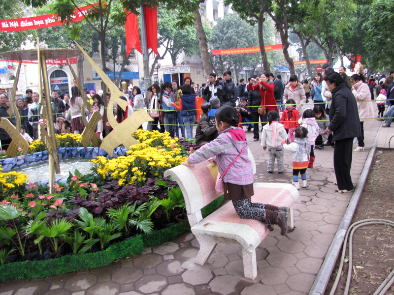 Mặc dù mới ngày đầu khai hội, song trong sáng nay, không ít du khách đã cho con em của mình chui qua hàng rào bảo vệ để chụp ảnh bên những tác phẩm phố hoa. Nhiều bạn trẻ cũng tận dụng điện thoại, máy ảnh, Ipad để chụp ảnh cùng hoa.