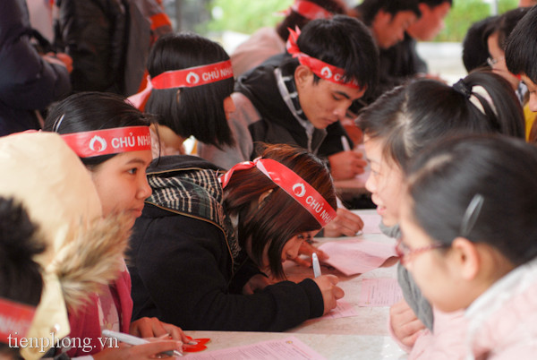 9h, thông tin từ Ban tổ chức cho biết, hàng trăm bạn đoàn viên, sinh viên đăng ký tham gia hiến máu. Dù Hà Nội mưa rét, nhưng rất nhiều bạn trẻ đã tới Cung triển lãm Quốc gia để tham dự Chủ Nhật Đỏ.