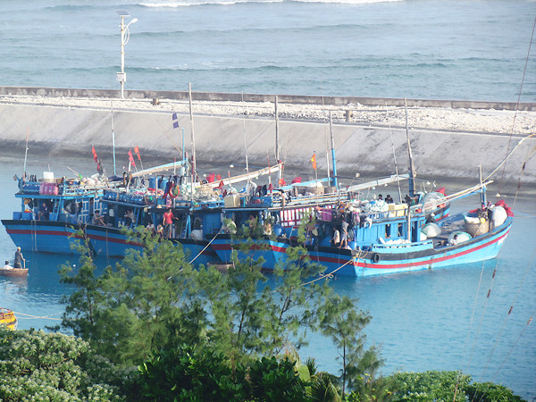 Tạo chỗ dựa tin cậy cho ngư dân vươn khơi đánh bắt xa bờ, các cơ sở dịch vụ hậu cần nghề cá đã và đang được xây dựng ở Trường Sa. Ảnh 3: Tàu cá tránh bão trong âu tàu đảo Song Tử Tây