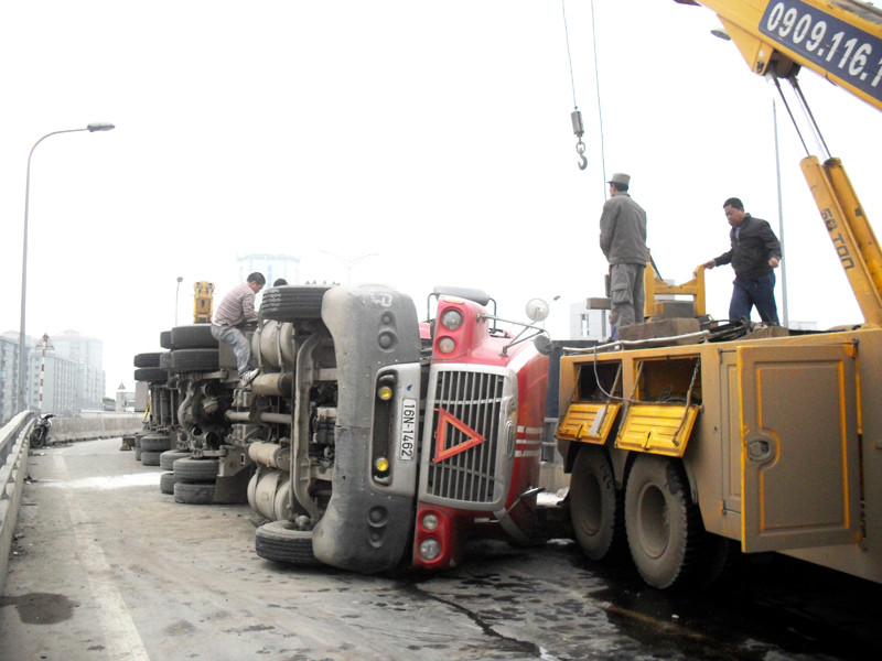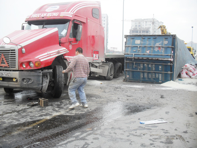 Vụ tai nạn xảy ra vào 3h sáng nay. Theo phụ xe Ngọ Duy Sơn, chiếc xe container BKS 16N-1462 chở gạo chạy từ Hải Phòng tới đoạn cua ở cầu vượt Pháp Vân thì bị mất lái và lật nghiêng.