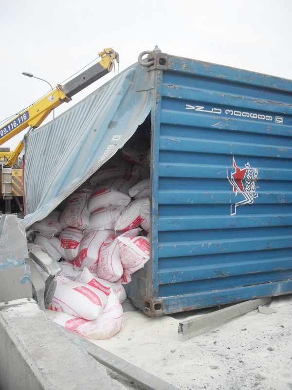 TPO – Khoảng 3h sáng nay (17-1), một chiếc xe container chở hàng chục bao tải gạo đã lật nhào trên đường dẫn cầu vượt Pháp Vân xuống đường Nguyễn Xiển (đoạn ngã tư Cầu Dậu, huyện Thanh Trì, Hà Nội).