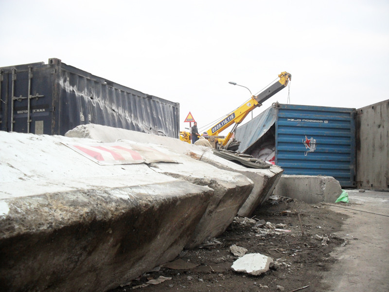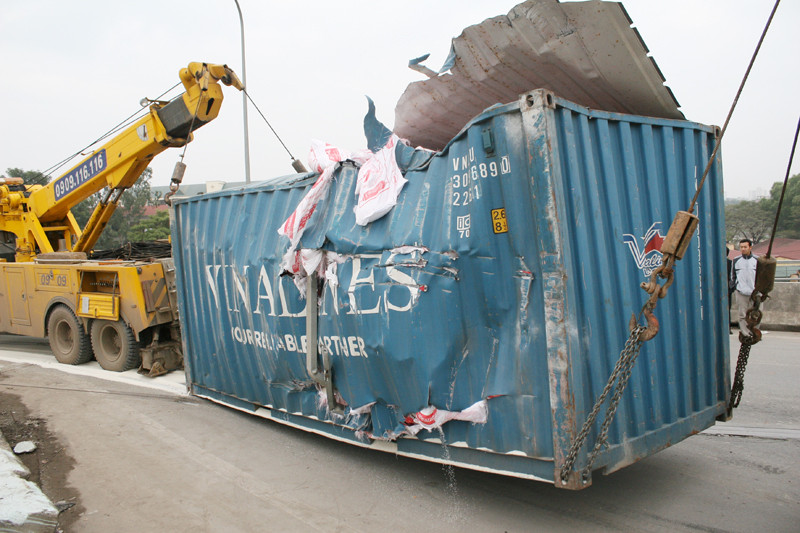 Tại hiện trường, chiếc xe container BKS 16N-1462 chở hàng chục bao tải gạo lật nhào giữa đường cầu vượt Pháp Vân, gầm xe hướng về phía thành cầu. Xe này chở hai container, trong đó, một container bị văng sang mặt cầu giao giữa hai làn đường, chiếc còn lại bị hất sát vào mép cầu, gạo văng tung tóe khắp đường. Khoảng 4m dải phân cách bằng bê tông bị hất sang một bên. Trên mặt cầu, vết bánh xe siết mạnh xuống đường tạo thành một rãnh kéo dài.