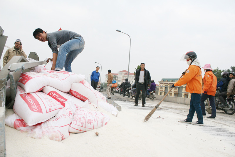 | Hàng chục bao tải gạo đổ văng khắp đường. |