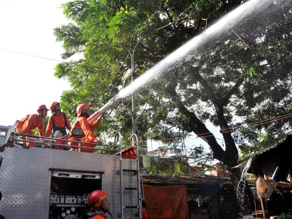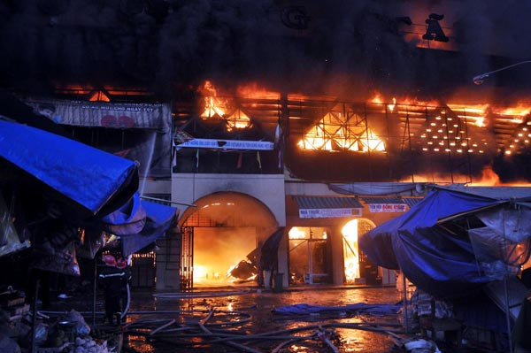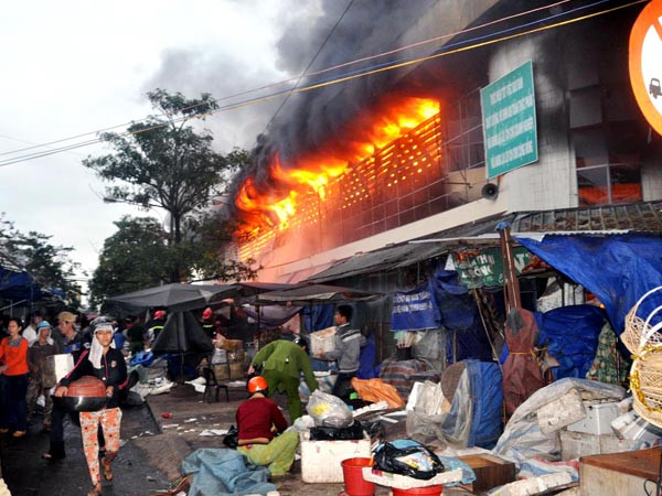 | Những tiểu thương nhỏ tranh thủ “cứu” những hàng hóa của mình vì lửa cháy lan . |