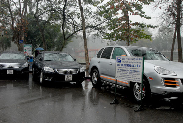 | Ô tô đỗ dưới lòng đường khu vực Hồ Hoàn Kiếm. |